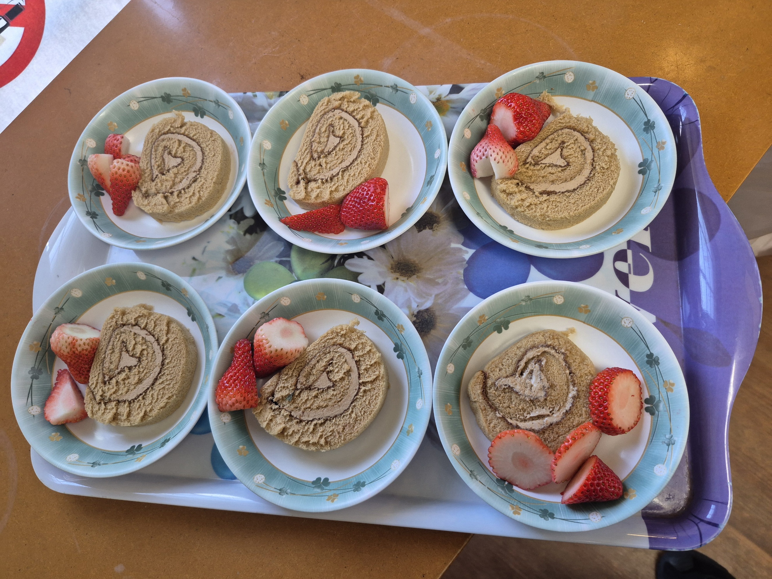 今日のおやつはロールケーキ イチゴ添え♡