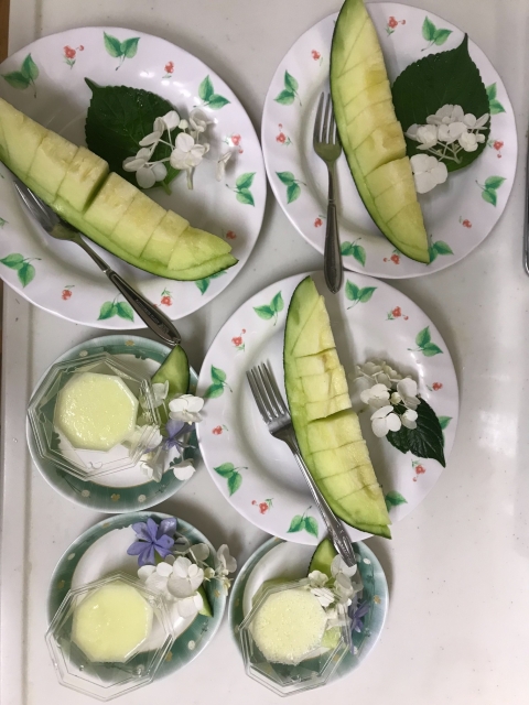 ご家族様からメロンを頂きました。ムース食を召し上がっている方はジュースにして飲んで頂きました。夏ですね。
