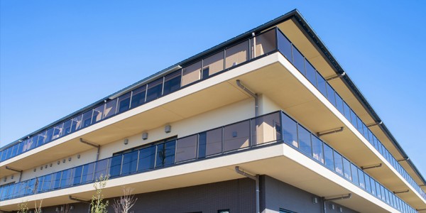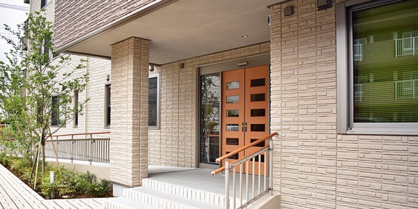 外観も高級なマンションそのものです。でもよくみると、スロープや手すりなどシニアにとって暮らしやすい設備が整っています。