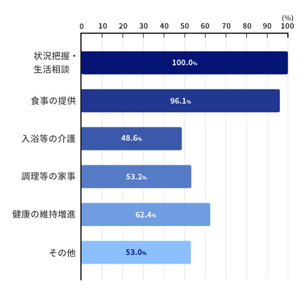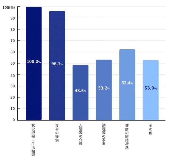 状況把握と生活相談は必須とされているサービスです。食事の提供もほぼ100%に近いですね。