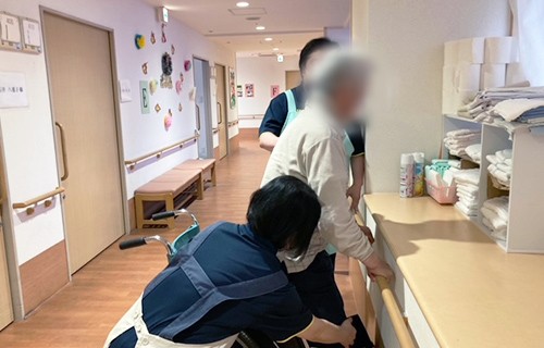 看護師さんから「立ち上がり方」を教わっています。手の力ではなく、姿勢をととのえてゆっくり行うのがコツだそうです。こうした専門的なトレーニングを受けることは、ご自宅に戻ったときの助けにもなりますね。