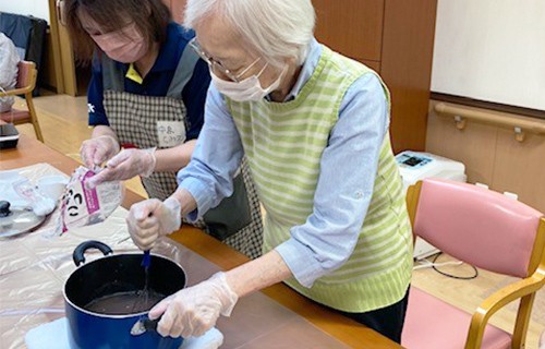おやつも手作りで!スタッフの方と一緒に、水ようかんを作っています。お料理は手先も動かしますし、順序立てて調理するなど脳トレにもなるのだとか。上手にできた水ようかんは、その日のおやつとしておいしくいただいたそうです。