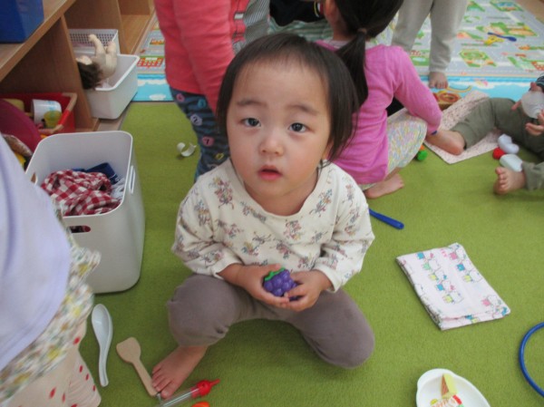 進級したお友だちは、早速新しいお部屋での遊びを楽しんでいます。ドーナツやお寿司のパーツを並べたり、おままごとをしたり…
