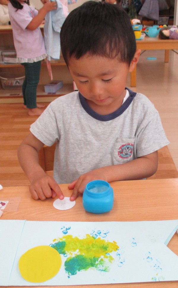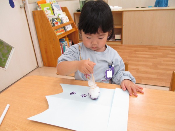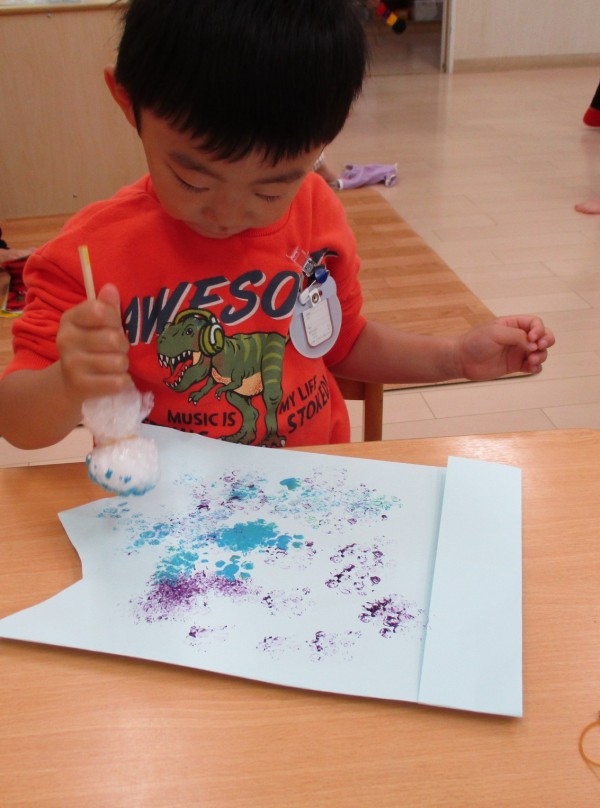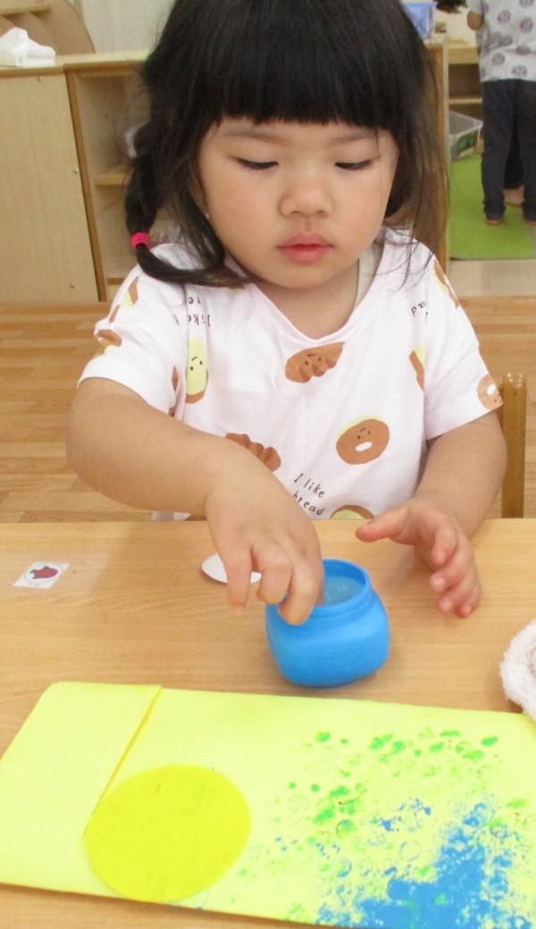 好きな色を2色選んでスタンプしました。模様が出来たり、色が混ざって変化が出ると嬉しそうにしていました。