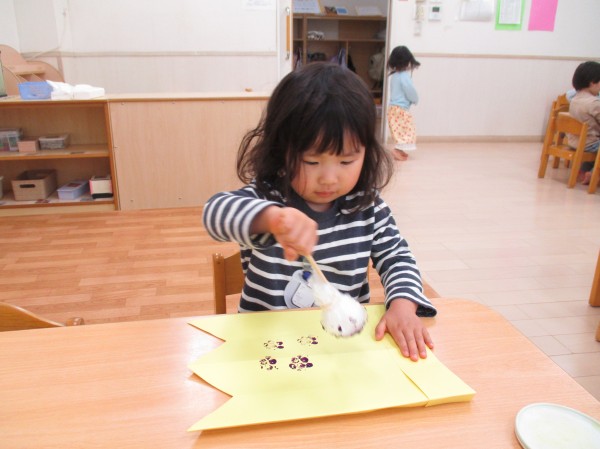 「人差し指で糊を付けていきましょう」と言うと「どの指?」「この指で合ってる?」と聞きながら糊を付けていました。