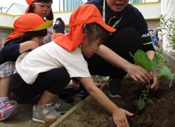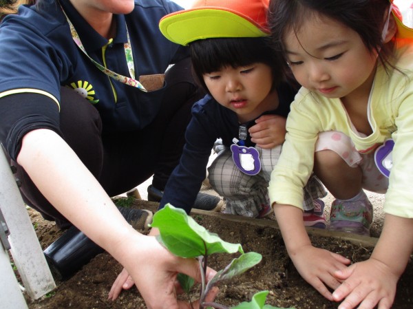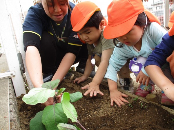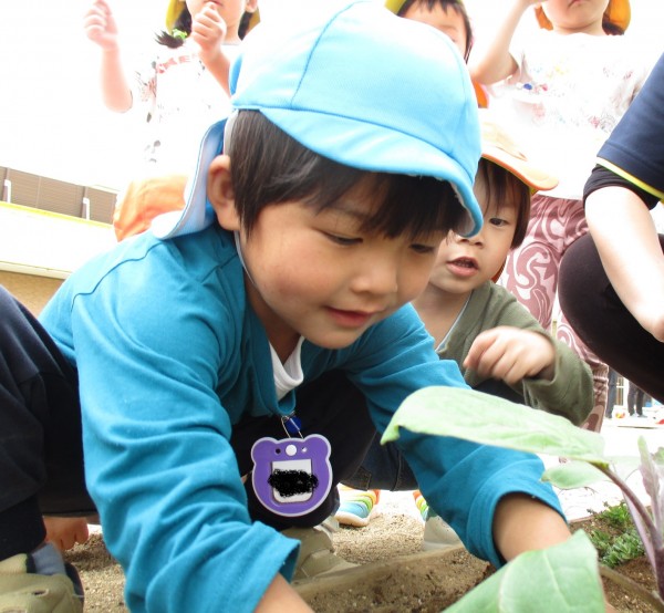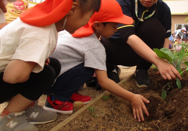 グループごとに順番にナスを植えました。1人ひとり保育者と一緒にナスに土を掛けて「大きくなってね」声を掛けました。