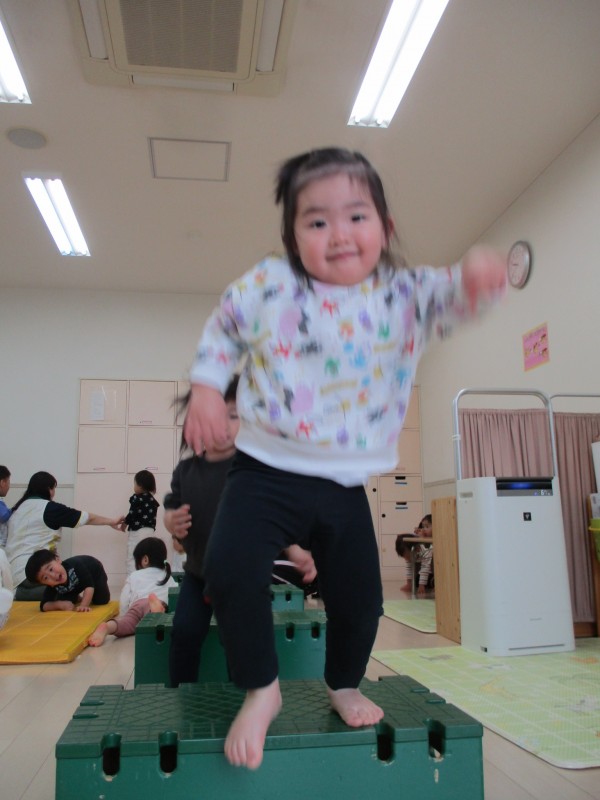 雨の日や園庭が使えない日は、室内でたくさん体を動かして遊んでいるらっこ組さん。