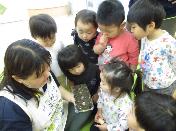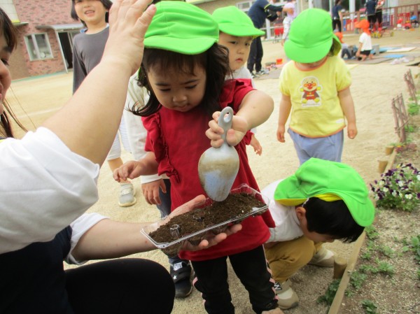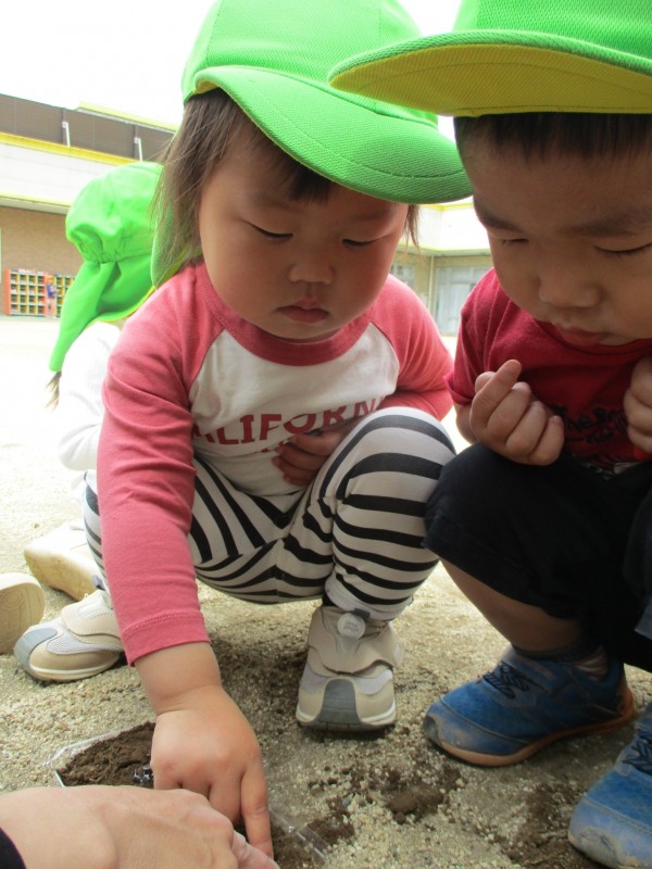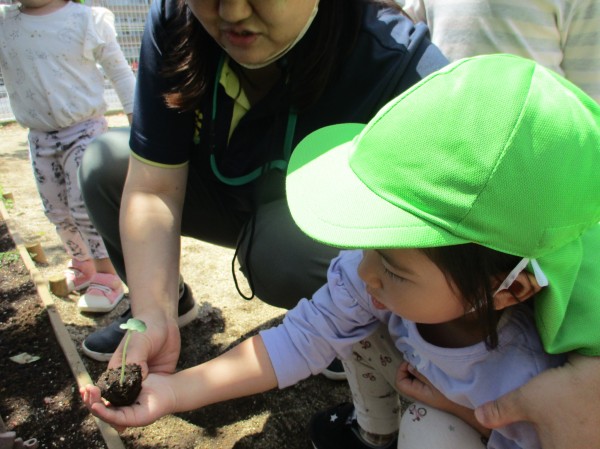 前年度の2歳児で育てたオクラから採れた種を今年度の2歳児が引き継いで植えてみることにしました。