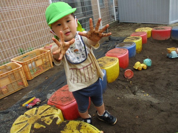 「みてー!」と泥んこの手を見せてくれたり、お友だちと並んで真似っこし合ったり…