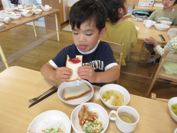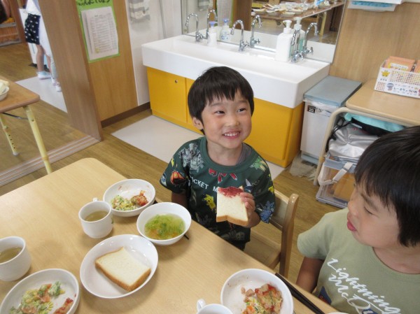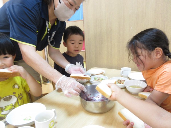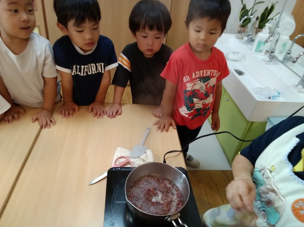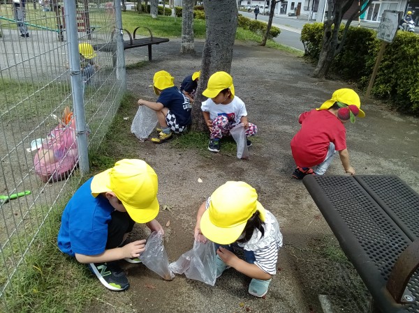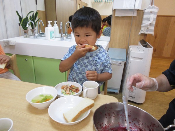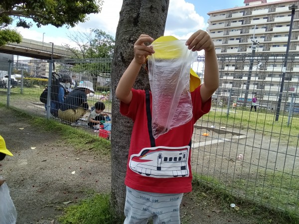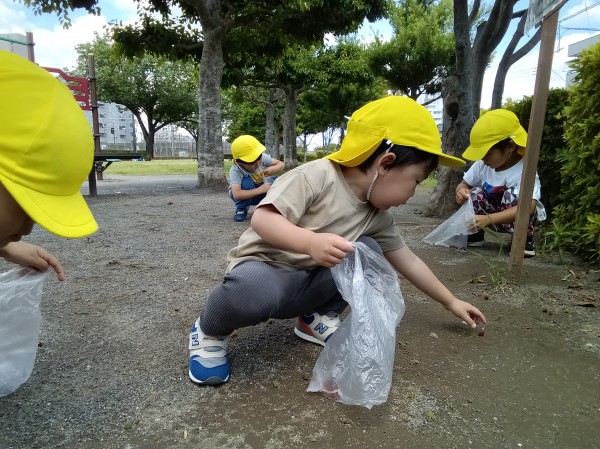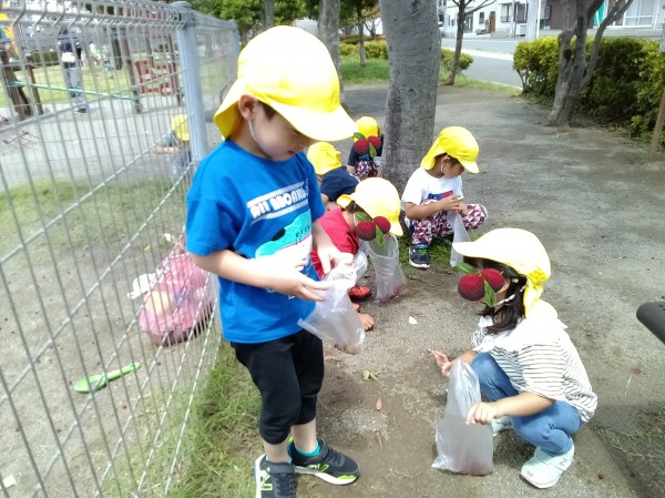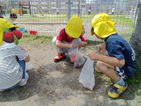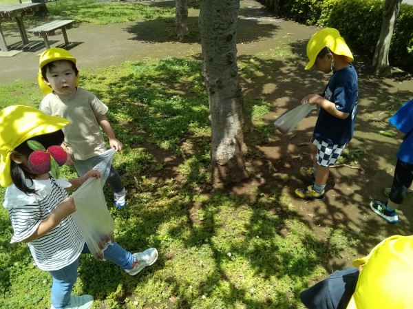 たくさんの新しい発見や自然物に触れる体験を楽しみながら、食への関心も膨らんだようです。やまももの樹木がある場所にお散歩に行くことを知るとビニール袋を片手にやまもも集めに意欲的な子どもたちです。