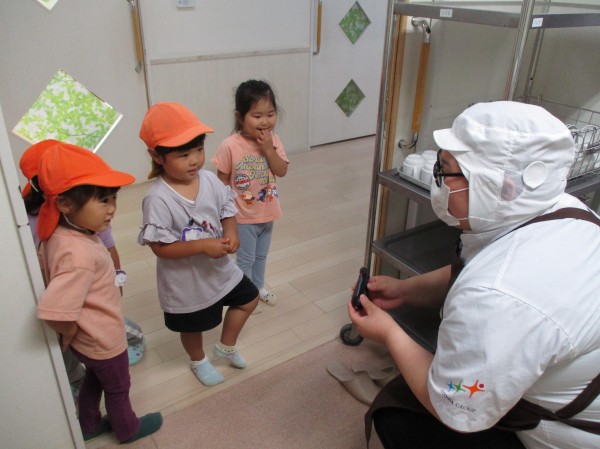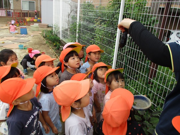 なすは一つだけなので、みんなで順番に触ったり見たりしました。「冷たい」「つるつるするー」と言いながら喜んでいました。