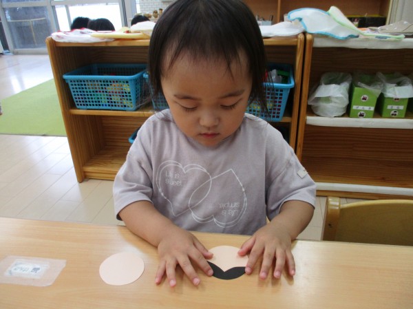 保育者が、糊を付けたパーツを渡し見本を見ながら貼りました。