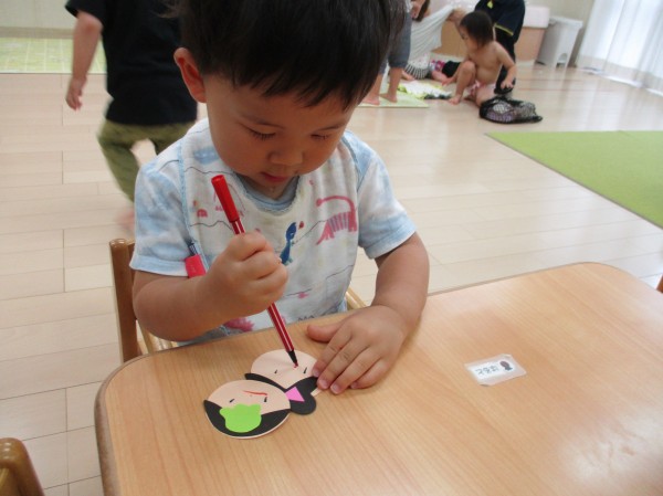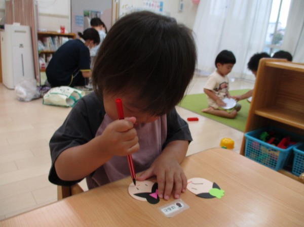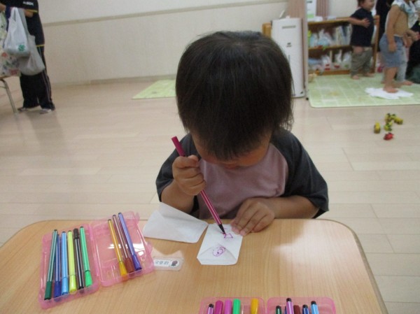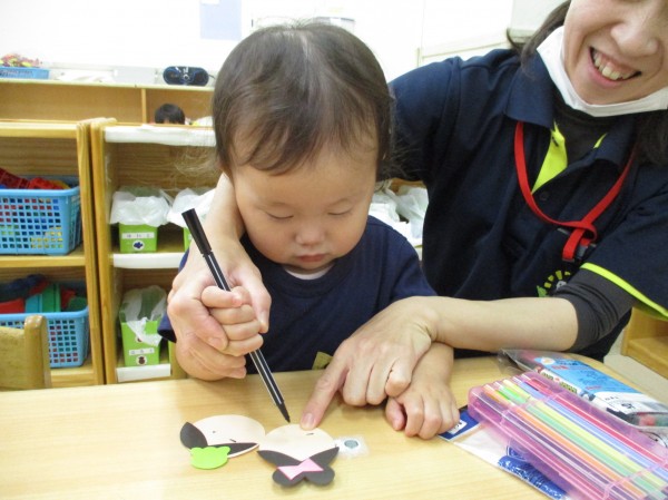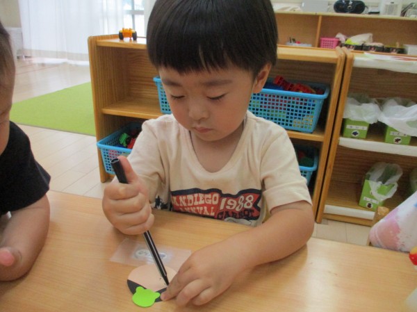 「チョン、チョン、ピーってするんだよ。」と描き方を説明すると、ペンを自分で持ち上手に描いていました。