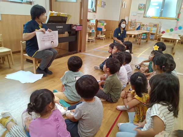 プール前の幼児クラスの子どもたちに、文部科学省が推進している「命(いのち)の安全教育」を紙芝居にしてお話をしました。