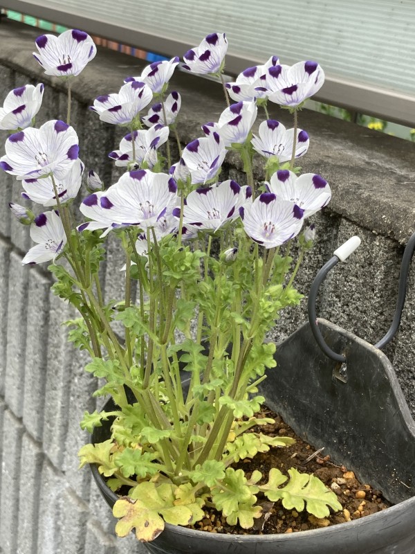 マクラタ(ファイブスポット)という品種です。「ネモフィラ・マクラータ」とも呼ばれます。ファイブスポットの名前の通り、花びらの先に濃い紫色の斑点が入ります。花径は3cm程でたくさんの花を付けます。