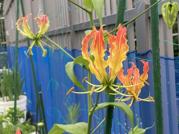 屋上庭園では、グロリオサが豪華な花を咲かせました。赤と黄色のグラデーションで塗り分けられた鮮明な花色の取り合わせや、ウェーブして、上に強く反転する花弁。緑色の四方に広がる6本の雄しべ、子房の真下から直角に前に突き出す三列開の柱頭をもつ雌しべは、見る人に強い印象を与え、その場をぱっと華やかな雰囲気で飾りたててくれる花です。