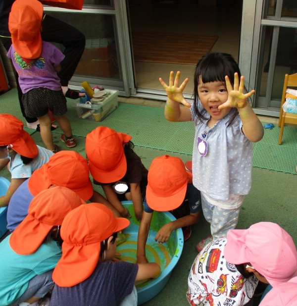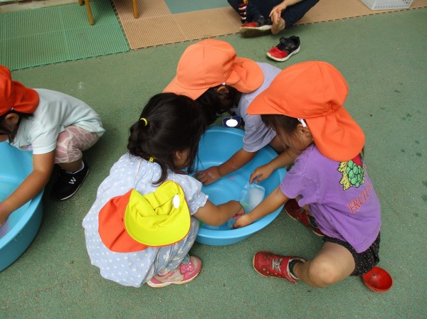 透明カップを渡すと、冷たいジュースをたくさん作って友だちと交換したり、他のタライの色水と混ぜてみたりと思い思いに遊んでいました。