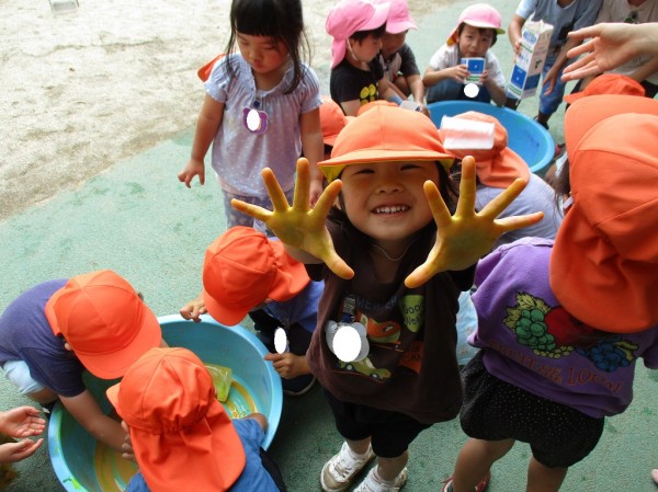 中には絵の具を手にたくさん付け、「見て!黄色になっちゃったよ♪」「緑~!」と絵の具の感触も楽しんでいる子もいました。