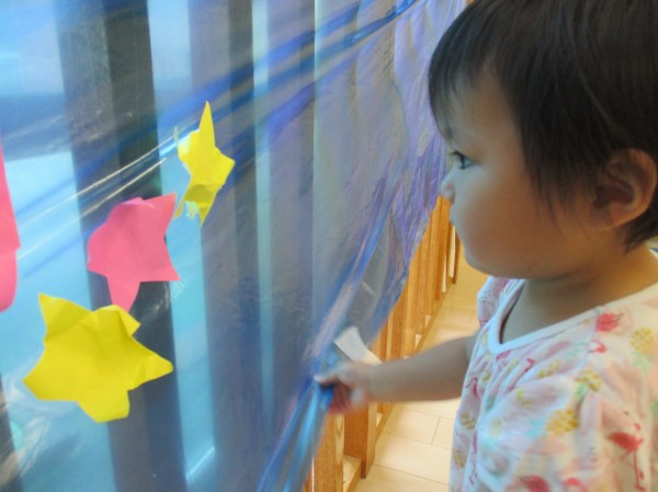午後は青色のビニール袋を天の川に見立てて星を貼って遊びました☆