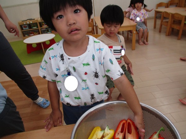 保育園でも夏野菜カレーが出ました。今回はカレーに入るパプリカの種取りのお手伝いをしました。