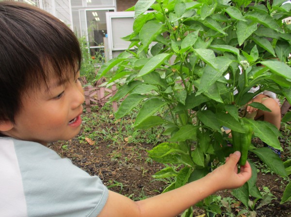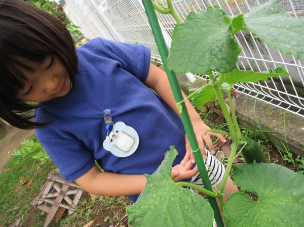 いるか組(4歳児)は畑できゅうり・ピーマン・オクラを育てています。