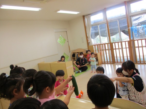 途中、周りのクラスのお友だちにも野菜を見せて「すごいね!」「美味しそう♡」と言われると得意気な子どもたちでした♪