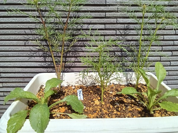 鮮やかなクルクマの下に、コルシカミントが緑のじゅうたんのようになればきれいだろうと考え、春に、クルクマの球根を植えた上にコルシカミントの種を蒔きました。