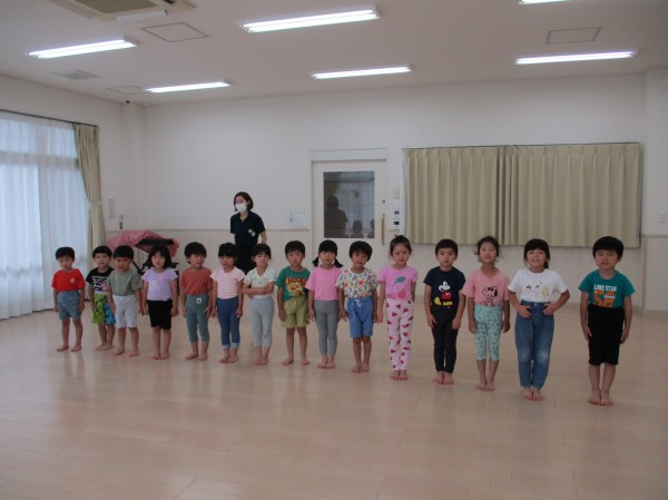 クラスごとに時間を設け、体操やストレッチ、簡単な集団遊びやリレー、かけっこ等を通してみんなで身体を動かして遊んでいます(^^♪