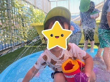 最初は水がなかなか出てこなくて「出てこないね」「あれー?水は?」と見つめていましたが、水が出てくるととても嬉しそうな子どもたちでした。水をすくっては保育者にかけることを繰り返し行ったり、ジュース屋さんをしたりとそれぞれ遊びを楽しんでいました。水遊びでの約束もしっかりと守っています。