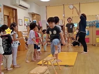 椅子の上に乗ってジャンプしたり跨いだりと、いつもできないことに挑戦して新鮮な気持ちの子どもたち。「今日は特別の日だよね」と言って嬉しそうに椅子に乗ってタンバリンやボールキャッチをしながらダイナミックにジャンプしていました。でんぐり返しをしたり飛行機になって走ったりなどたくさん体を動かして汗だくになっていました。