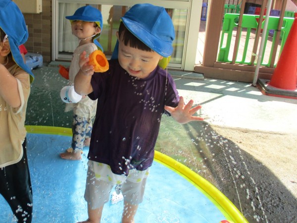 こどもの家・志木中宗岡 あひる組(1歳児)シャワーマットで水遊び!!