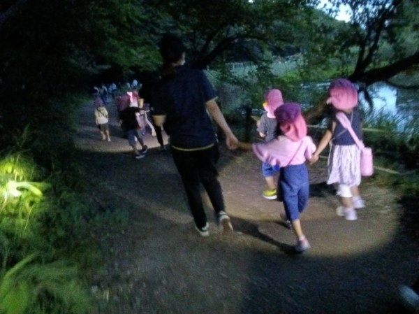 夜はホタル鑑賞会に出掛けました‼懐中電灯の明かりだけを頼りに真っ暗な夜道を歩き、無事に蛍の光を観ることが出来て大人も子どもも感動しました。