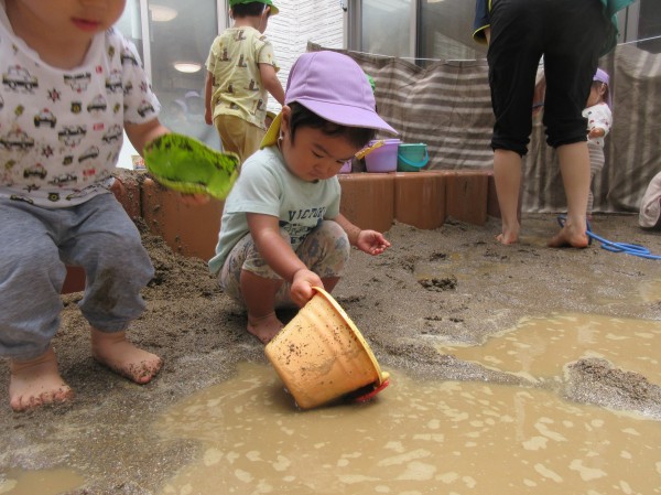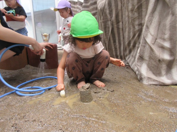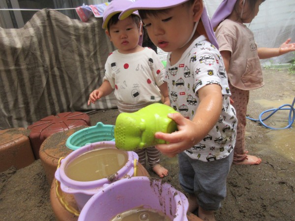 今回は1歳児りす組・2歳児うさぎ組の水遊びの様子をお伝え致します。