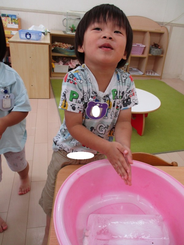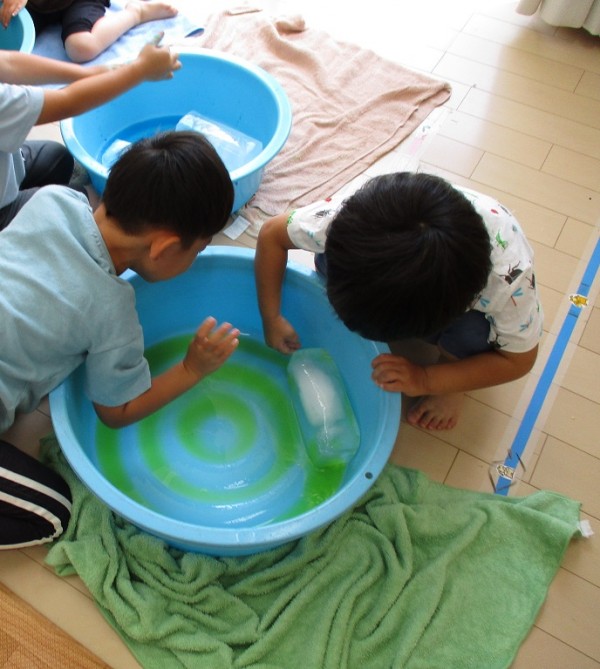 大きな氷を作りタライに広げると、「なになに!?氷だ!」「触っていい?」と早く遊びたい様子を見せる子どもたち。