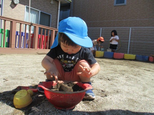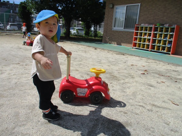 この頃、水遊びや室内遊びの日が多かったので、久しぶりの園庭で子ども達も大興奮!!靴を履いたら、嬉しそうに歩きだす子や、砂場やコンビカー等の好きな遊びを目掛けて元気いっぱい走っていく子も(^▽^)