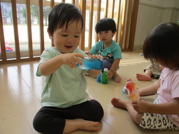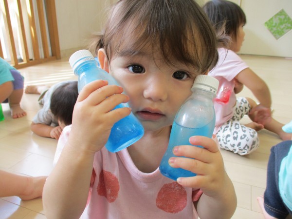 手で握ったり頬に当てて冷たさを楽しむ子や、振るとシャカシャカ音が鳴るのを楽しむ子、好きな色を綺麗に並べて嬉しそうに眺めている子や、ジュース屋さんみたいに並べてお友達と一緒にごっこ遊びをしている子など、みんなそれぞれの楽しみ方で微笑ましい一面を見ることが出来ました♡