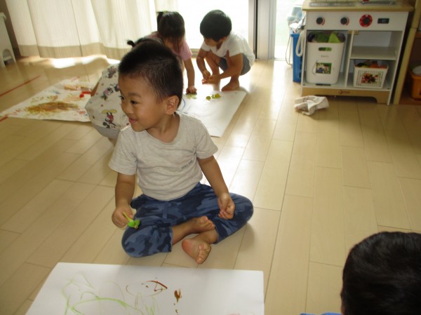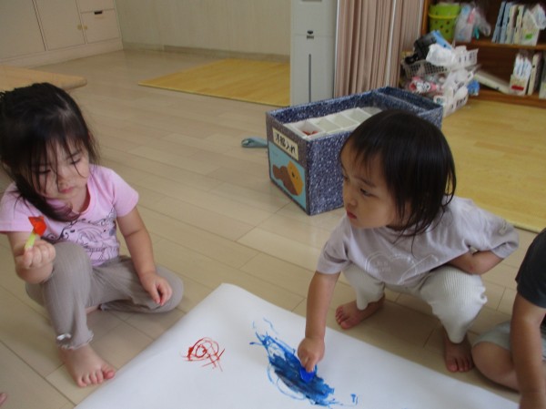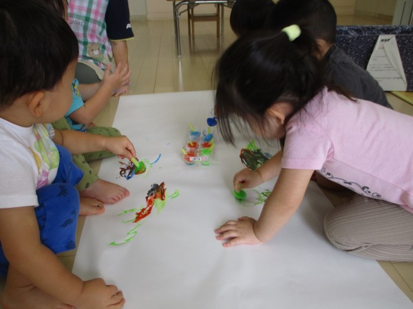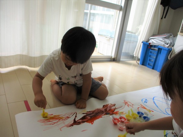 色が混ざるのも発見し、「つぎはー、これ!」と違う色を選んだり、