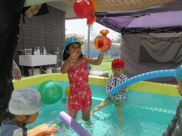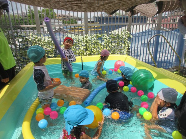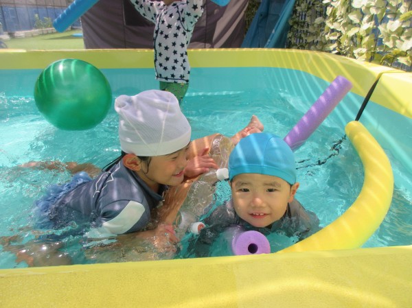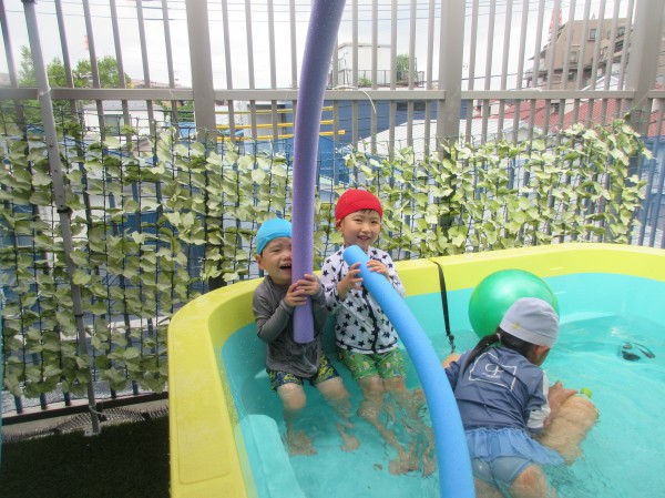 運動遊び後は水遊び、プールに入って過ごしています。プール遊びでは降ってくる水をキャッチしたりタライの中の水を保育者が滝のようにして雨を降らせると身体を近くに寄せて水を浴びるのを楽しんでいた子どもたちです。