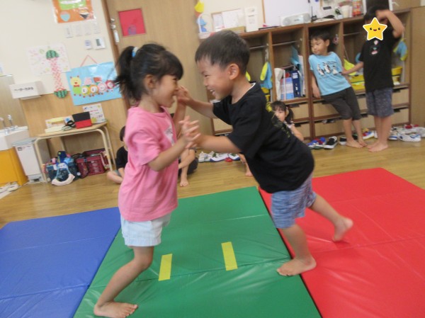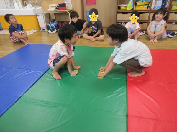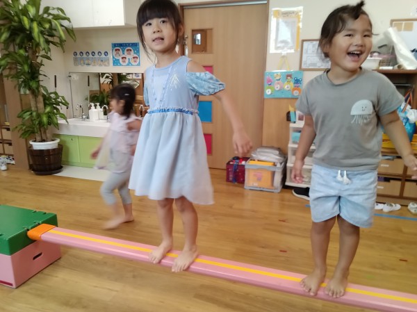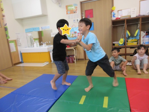 運動遊びでは体操をしてからお相撲や尻相撲、平均台をして遊びました。お相撲や尻相撲では「はっけよい、のこった」の掛け声と同時にお友だちを押して勝負をし、とても大盛り上がりでした。はっけよいのポーズが様になっていて可愛らしかったです。平均台では登ったり下りたりを何回も繰り返したりじゃんけんゲームをしたりなど様々な遊び方で体を動かしました。