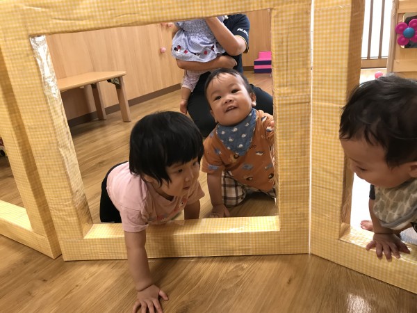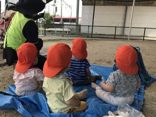 向かう途中で大きなトラックやバスに大興奮なひよこ組のお友だち。手を振ったり、「お!」と指を差して嬉しそうにしていました。公園に着いてすぐにお茶休憩をしながら電車を見ました。近くで見る電車は迫力満点でした。早めに帰園し、お部屋の中でゆっくり過ごしました。絵本を見たり、トンネルくぐりを楽しんだりとそれぞれ好きな遊びを楽しんでいました。週末で疲れもあったのか、ゴロゴロタイムを作り、みんなでゴロゴロして過ごしました。