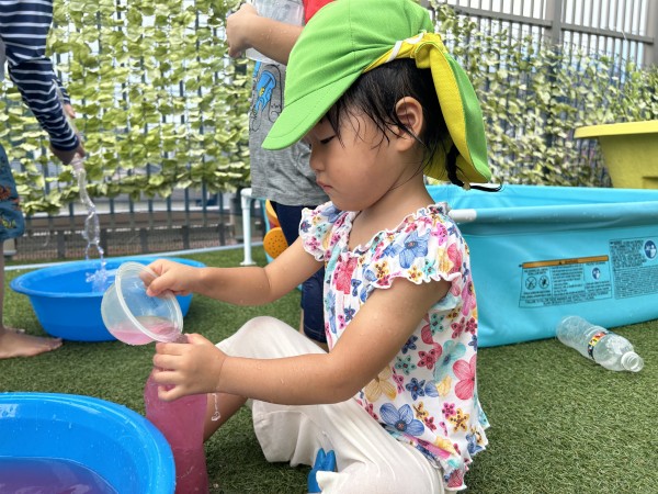 今日は、屋上へ行き運動遊びをしてから水遊びをしました。