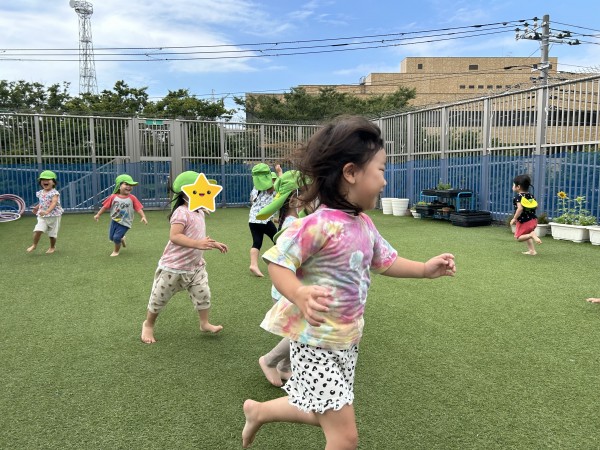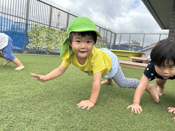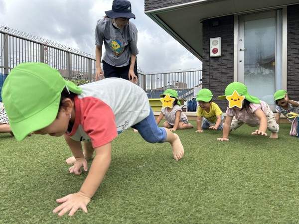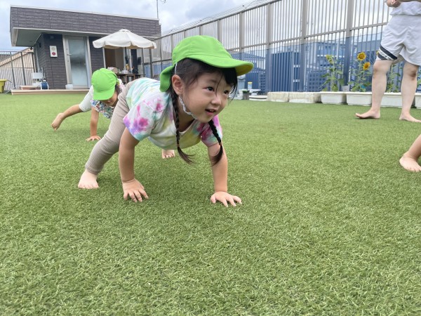 屋上の端から端までかけっこをしたり、ライオンやうさぎ、クマの真似をしたりたくさん身体を動かしました。クマさん歩きでは、膝をつけないで歩いてみることを伝えるとしっかりとおしりを持ちあげて膝をつけずにクマの真似が出来ました。保育者がしっぽをつけると「しっぽだ~」「おいかけよう!!」としっぽ取りが始まりました。屋上を駆け回り、たくさん走ってしっぽを取ることが出来るとみんなで喜んでいました。汗をたっぷりかいたため、水浴びをして遊びました。