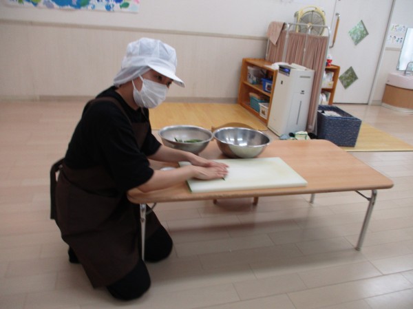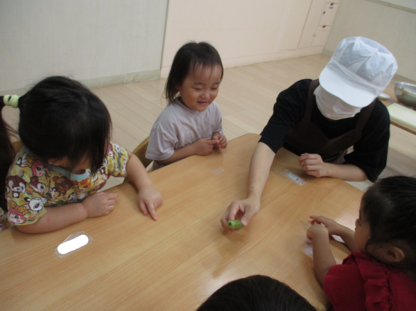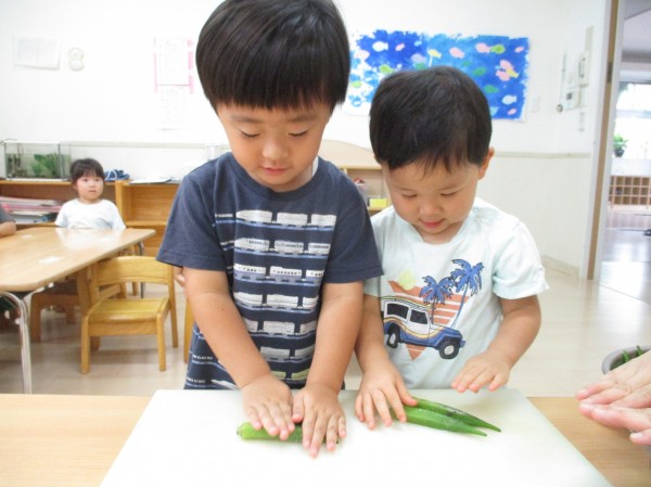 こどもの家・志木中宗岡 らっこ組(2歳児クラス)オクラの板摺り!