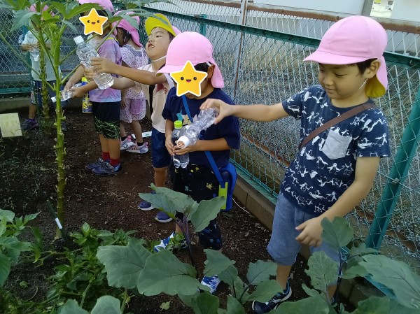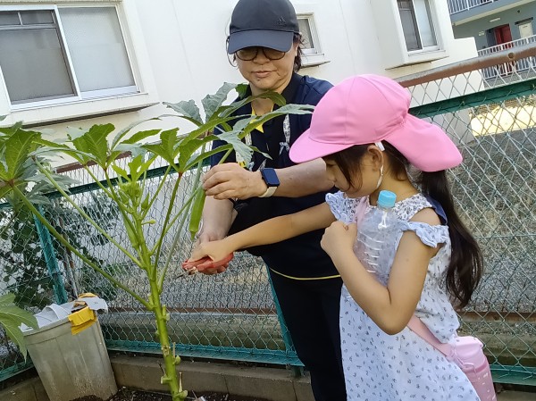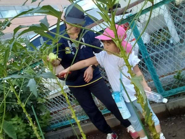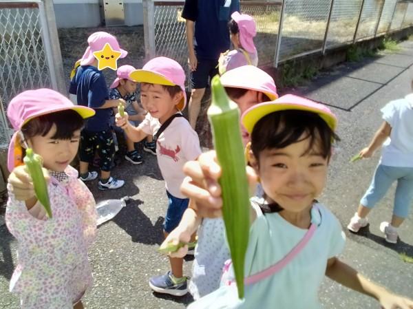 今日は畑の水やりをしに行きました。水をあげていると大きくなっているオクラやピーマンを発見…!「これ収穫できるんじゃない?」と子どもたちから気づいて収穫することになりました。「ぼくはこのオクラにする!」と言ってハサミで力を入れて上手に切ることが出来収穫を喜んでいました。一人一個お家にお持ち帰りしていいということを伝えると「やったー」と大喜びで、帰ってきて大事そうに袋に入れてリュックにしまっていた子どもたちです。帰ってきて事務所の先生達に得意げに見せていた子どもたちが可愛らしかったです。ペットボトルと大きさを比べっこしながら終始ニコニコでした。