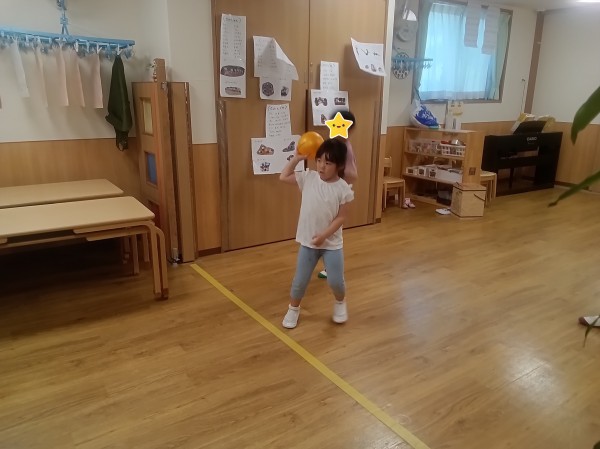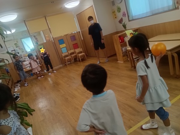 お部屋でドッチボールをして遊びました。子どもたちでチーム分けをしながら「○○くん狙おうかな」「次は僕にボール回してね」と同じチーム同士で作戦を練り、仲良く楽しんでいました。たくさん水分補給を取りながらお部屋での時間を楽しみました。その後は水遊びをして過ごしています。