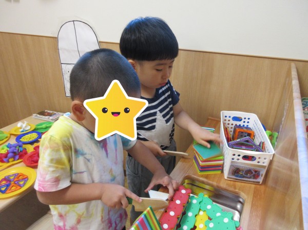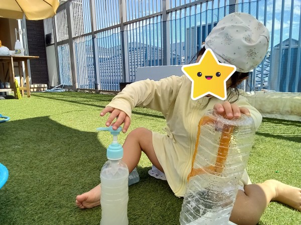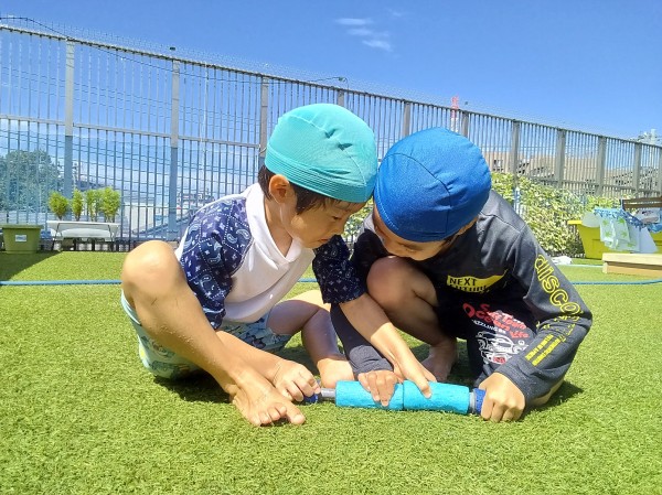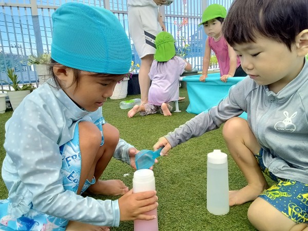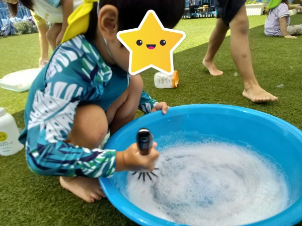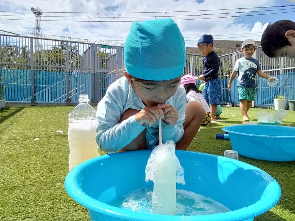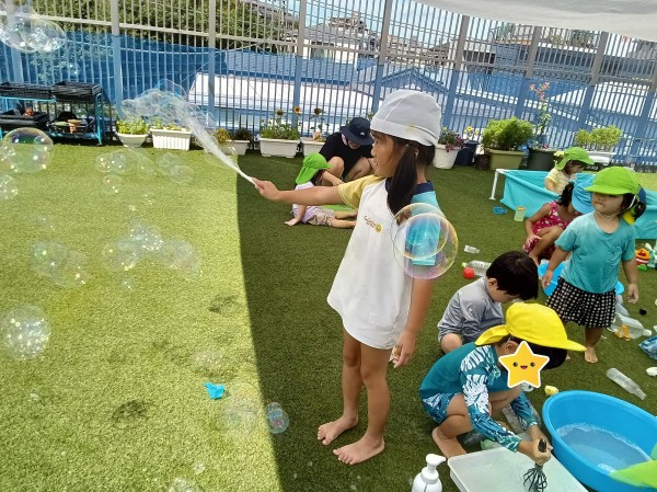 今日は、屋上で水遊びをしました。シャボン玉液を入れると、一生懸命に泡立て始めた子どもたち。たちまちタライの中は、真っ白な泡でいっぱいになりました。そこへ、色水を足したり、容器へ入れ替えたりと、それぞれの遊びを始めました。また、うちわの骨の部分を保育者が持ってくると、「これでシャボン玉作りた~い!!」と集まってきました。いくつかのうちわを使って、とても細かいきれいなシャボン玉をたくさん飛ばすことができました。他のお友だちは、水鉄砲をしたり、水泳帽の洗濯ごっこをしたり、ストローで泡をたくさん吹きだしたり、好きな遊びをたくさん楽しみました。室内では、うさぎ組のお部屋でお店屋さんごっこをしたり、マグフォーマーなどで遊んで過ごしました。