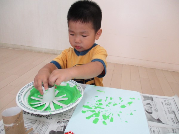 トイレットペーパーの芯の先を放射線状に切ったものでスタンプをすると、綺麗な模様が表れて