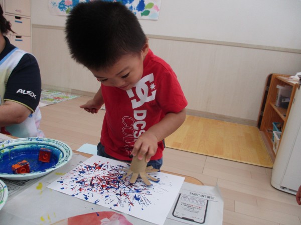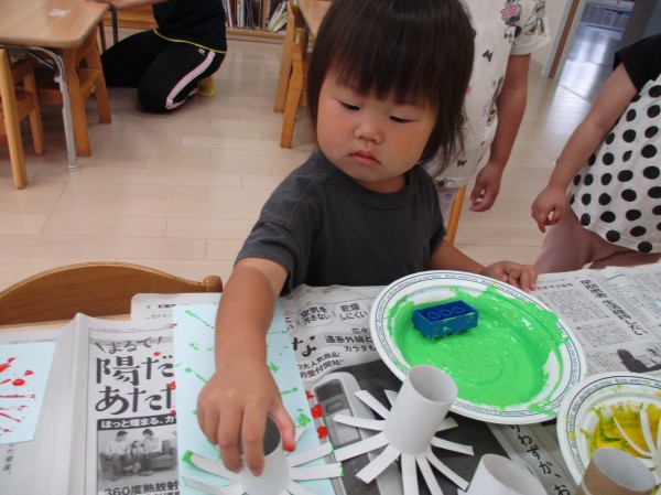 2歳児クラスでは、トイレットペーパーの芯とブロックを使って、スタンプをしました。