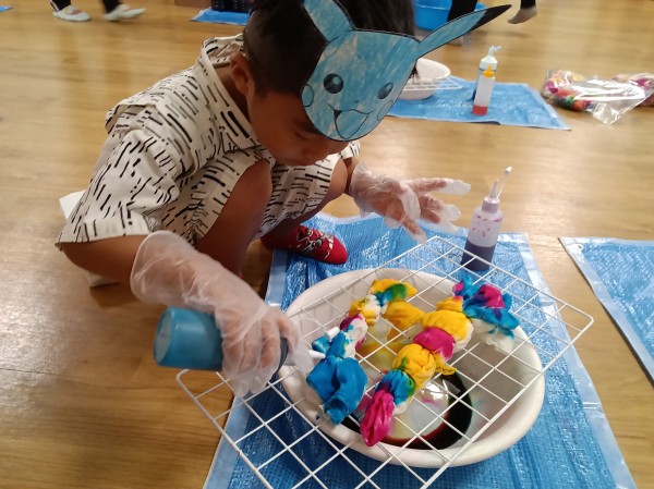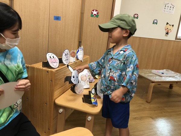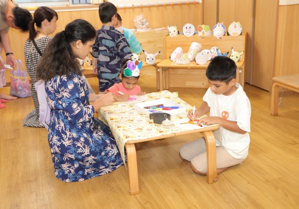 子どもたちが色塗りをして作ったお面を選び嬉しそうに被り、自分で好きなようにお絵描きしてうちわ作りも楽しみました。