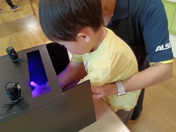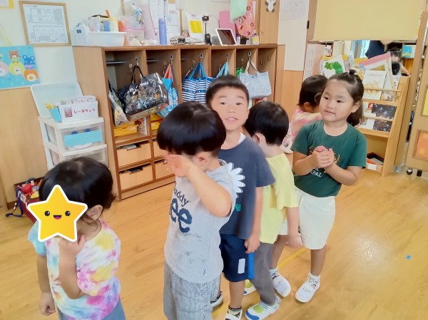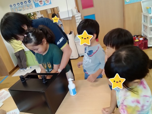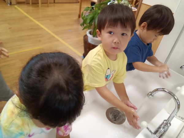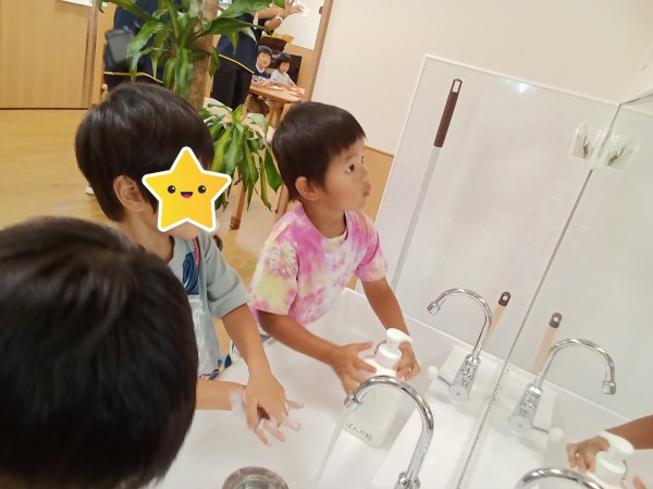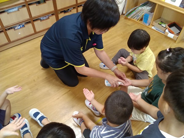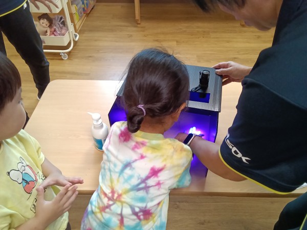 9月になり、外遊びの機会が増えてきました。屋外から帰った時の手洗いは、感染症予防においてとても重要です。手洗いの習慣はついていますが、ささっと洗うだけの子もいるので、きちんと汚れが落とせているのか心配です。今日は、きれいに洗うことを意識づけるのを目的として、手洗いチェッカーを使用して健康教育を行いました。
